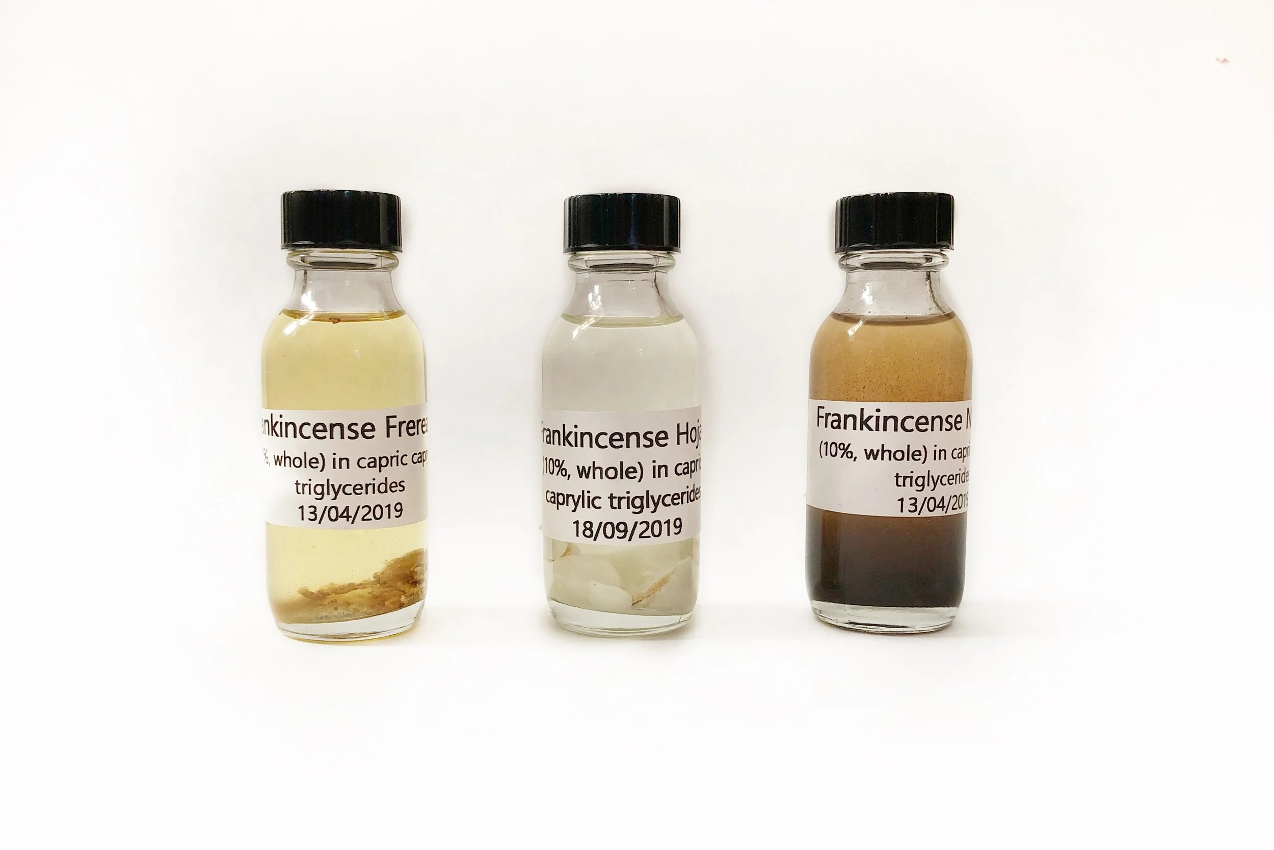 This was simple to do. I made a 10% extract by simply weighing 3g of frankincense and topping up with 27g of capric caprylic triglycerides. I then left them on my south facing window sill for around 4 months. The Hojari was started around mid september, 4 months after the other two.